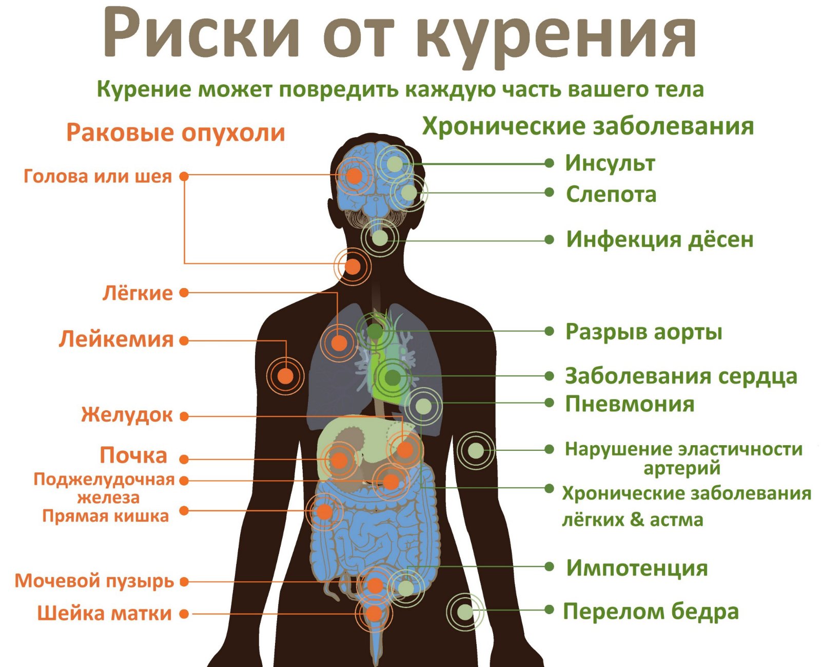 Вред курения в том, то оно вызывает три основных заболевания: рак легких, хронический бронхит, коронарная болезнь. Уже давно доказано, что табак является причиной смертности от рака легкого в 90 % всех случаев, от бронхита и эмфиземы в 75 % и от болезни сердца в примерно 25 % всех случаев.