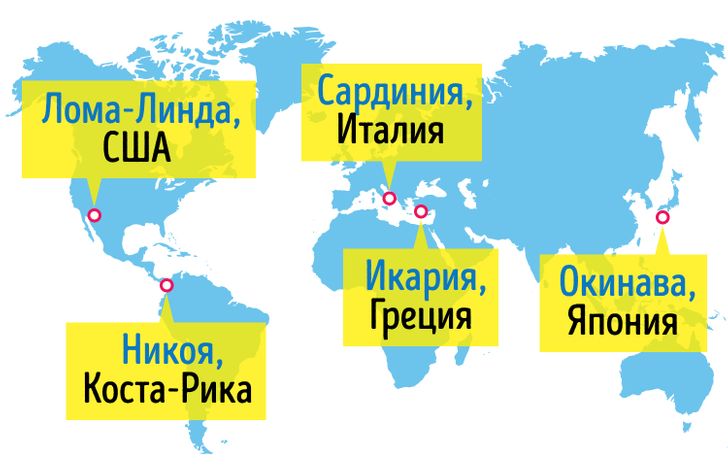 "Голубые зоны" – это несколько небольших регионов мира, в которых в пропорции, значительно больше среднестатистической, декларируется проживание людей, живущих значительно дольше среднестатистического срока. Само понятие "голубые зоны" появилось благодаря Майклу Пулену и Джанни Песу, которые обнаружили, что в провинции Нуоро, расположенной на итальянском острове Сардиния, проживает самое большое в мире количество людей, отметивших 100-летний юбилей. Позже к исследованиям Пулена и Песа присоединился Дэн Бюттнер, вместе с которым ученые выделили 5 зон по всему миру, где жители отличаются особым долголетием, где продолжительность жизни прибилижается к библейским 120 годам. В общественный обиход этот термин ввёл Дэн Бюттнер в декабре 2005 года в статье "Секреты долгой жизни" ("The Secrets of a Long Life"), вынесенной на обложку журнала National Geographic. Где находятся эти зоны? В чём же особенность этих зон? Чем отличаются эти люди?