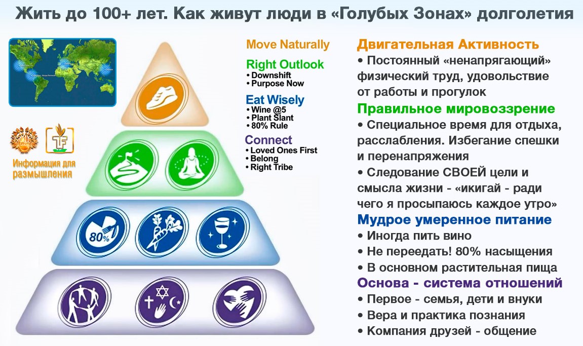 "Голубые зоны" – это несколько небольших регионов мира, в которых в пропорции, значительно больше среднестатистической, декларируется проживание людей, живущих значительно дольше среднестатистического срока. Само понятие "голубые зоны" появилось благодаря Майклу Пулену и Джанни Песу, которые обнаружили, что в провинции Нуоро, расположенной на итальянском острове Сардиния, проживает самое большое в мире количество людей, отметивших 100-летний юбилей. Позже к исследованиям Пулена и Песа присоединился Дэн Бюттнер, вместе с которым ученые выделили 5 зон по всему миру, где жители отличаются особым долголетием, где продолжительность жизни прибилижается к библейским 120 годам. В общественный обиход этот термин ввёл Дэн Бюттнер в декабре 2005 года в статье "Секреты долгой жизни" ("The Secrets of a Long Life"), вынесенной на обложку журнала National Geographic. Где находятся эти зоны? В чём же особенность этих зон? Чем отличаются эти люди?