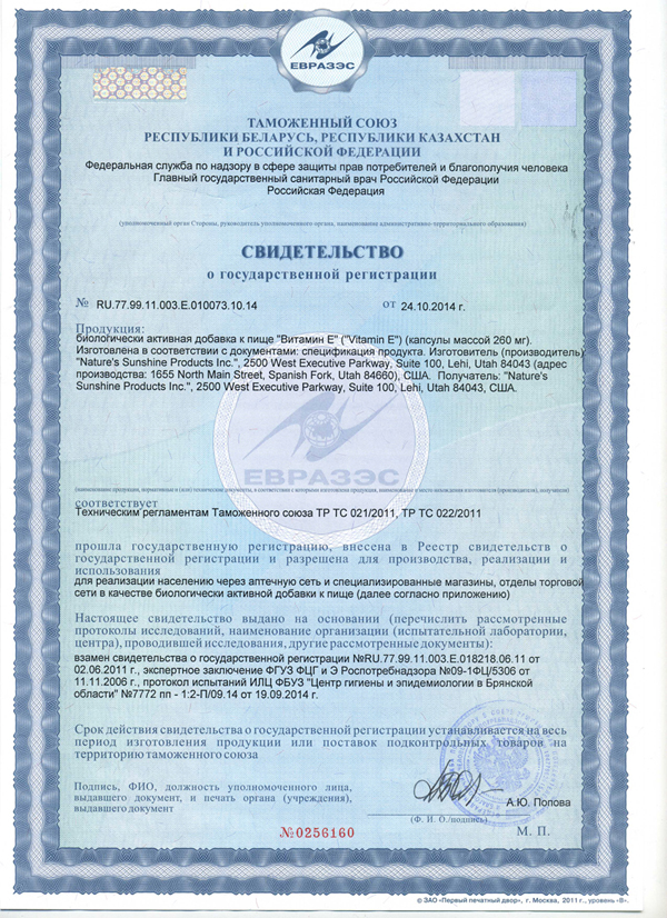 Чистый витамин Е, представленный в его наиболее активной форме и в оптимальной для применения дозировке - 100 МЕ (100 мкг). Вырабатывается из натуральных растительных масел.
